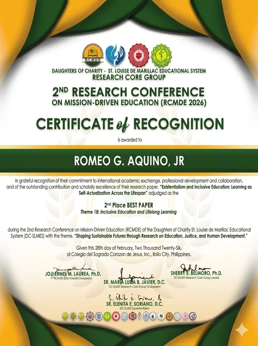 This vision deepens in his award-winning paper, “Existentialism and Inclusive Education: Learning as Self-Actualization Across the Lifespan” , which earned 2nd Place (Faculty Category under the theme: Inclusive Education and Lifelong Learning) at the DC-SLMES 2nd Research Conference on Mission Driven Education.